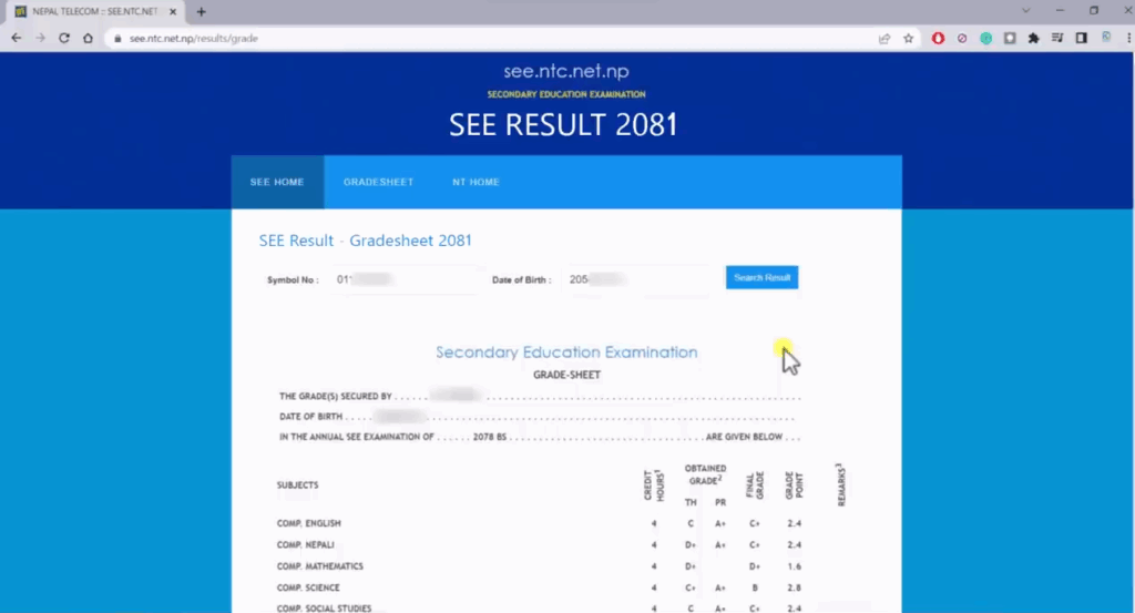 The first and easiest way to know your SEE result online is by using different websites. These websites offer a user-friendly interface where students can enter their required information, such as their Symbol number and Date of birth, to instantly access their SEE results. To check the result follow the steps given below: