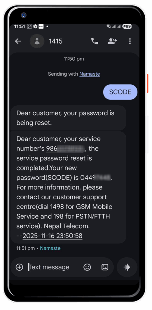 To get your Nepal Telecom (NTC) security code, send an SMS with the text “SCODE” to 1415. You will receive an 8-digit security code in a reply message to your phone.